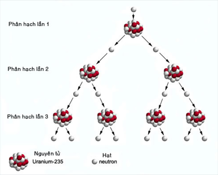 Chất phóng xạ (hay đồng vị phóng xạ) Uranium-235 là nguyên tố phổ biến được dùng trong nhà máy điện hạt nhân, là đồng vị không bền và có khả năng xảy ra quá trình phản ứng phân hạch bằng cách bắn phá các neutron vào nguyên tử. Một nguyên tử bị tách ra thành 2 nguyên tử có số khối nhỏ hơn và giải phóng thêm neutron. Tổng khối lượng sản phẩm nhỏ hơn tổng khối lượng tác chất ban đầu, khối lượng bị mất đã chuyển sang dạng nhiệt và bức xạ điện từ, đồng thời nó giải phóng một năng lượng lớn rất hữu ích theo phương trình nổi tiếng E = mc2.